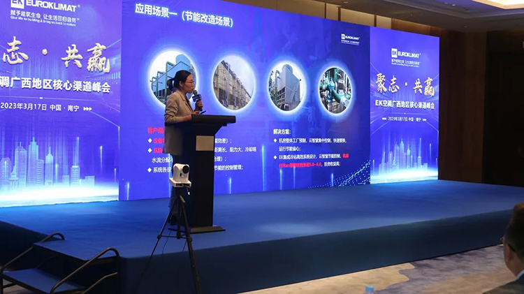 會上,EK空調(diào)大型冷水機事業(yè)部韓惠芝和現(xiàn)場嘉賓詳細(xì)介紹了EK云智慧高效集成冷站的應(yīng)用場景、產(chǎn)品優(yōu)勢以及項目案例。
