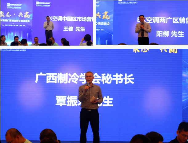 會議開始,EK空調(diào)南寧辦事處總經(jīng)理王勝龍、柳州辦事處總經(jīng)理周文光以及廣西制冷學(xué)會理事長黃孝軍先生分別上臺致辭。