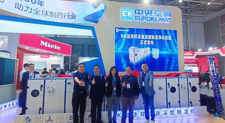 本屆展會(huì),EK以制藥廠房潔凈度、溫濕度需求以及高能耗痛點(diǎn)為核心,針對(duì)制藥車(chē)間、藥品倉(cāng)儲(chǔ)、實(shí)驗(yàn)室等不同場(chǎng)景提供低碳化、智能化的專(zhuān)業(yè)空氣解決方案。EK高效雙冷源深度除濕凈化機(jī)組作為本次參展的新品,在本屆藥機(jī)展隆重揭幕。