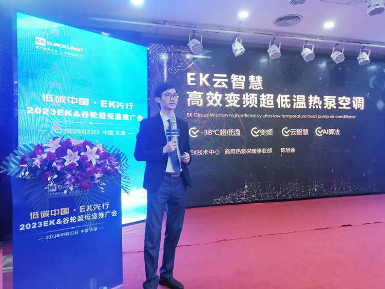 推廣會(huì)現(xiàn)場,EK空調(diào)商用熱泵采暖事業(yè)部產(chǎn)品經(jīng)理陳旭金和現(xiàn)場嘉賓介紹了EK超低溫?zé)岜玫陌l(fā)展歷史、產(chǎn)品陣容、系統(tǒng)優(yōu)勢以及在嚴(yán)寒地區(qū)各行業(yè)的應(yīng)用案例。