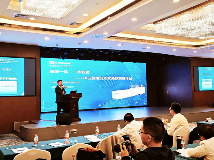 年會現(xiàn)場,EK空調(diào)大型冷水機(jī)事業(yè)部徐楓林以《高效一體、一步到位——EK云智慧分布式高效集成冷站》為題發(fā)表演講,和現(xiàn)場嘉賓重點(diǎn)介紹了EK高效機(jī)房系統(tǒng)核心產(chǎn)品——云智慧分布式高效集成冷站的組成、特點(diǎn)、優(yōu)勢、應(yīng)用場景和項(xiàng)目案例。