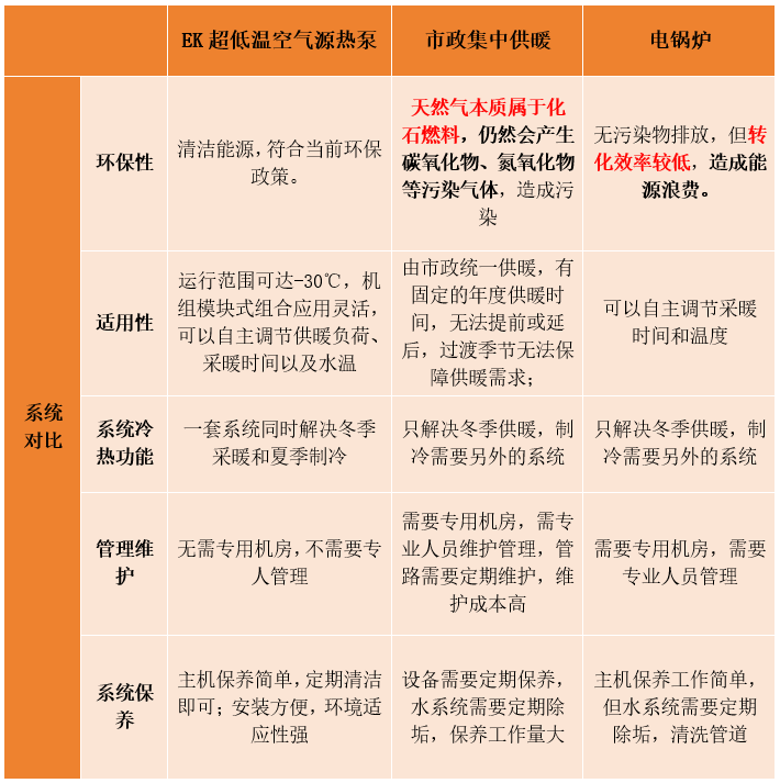 以目前在我國(guó)北方寒冷地區(qū)幾種常見的采暖方式對(duì)比,EKAH系列超低溫空氣源熱泵機(jī)組采用EVI噴氣增焓技術(shù),節(jié)能率較高,受環(huán)境因素影響小,系統(tǒng)運(yùn)行穩(wěn)定,適合長(zhǎng)期供暖。