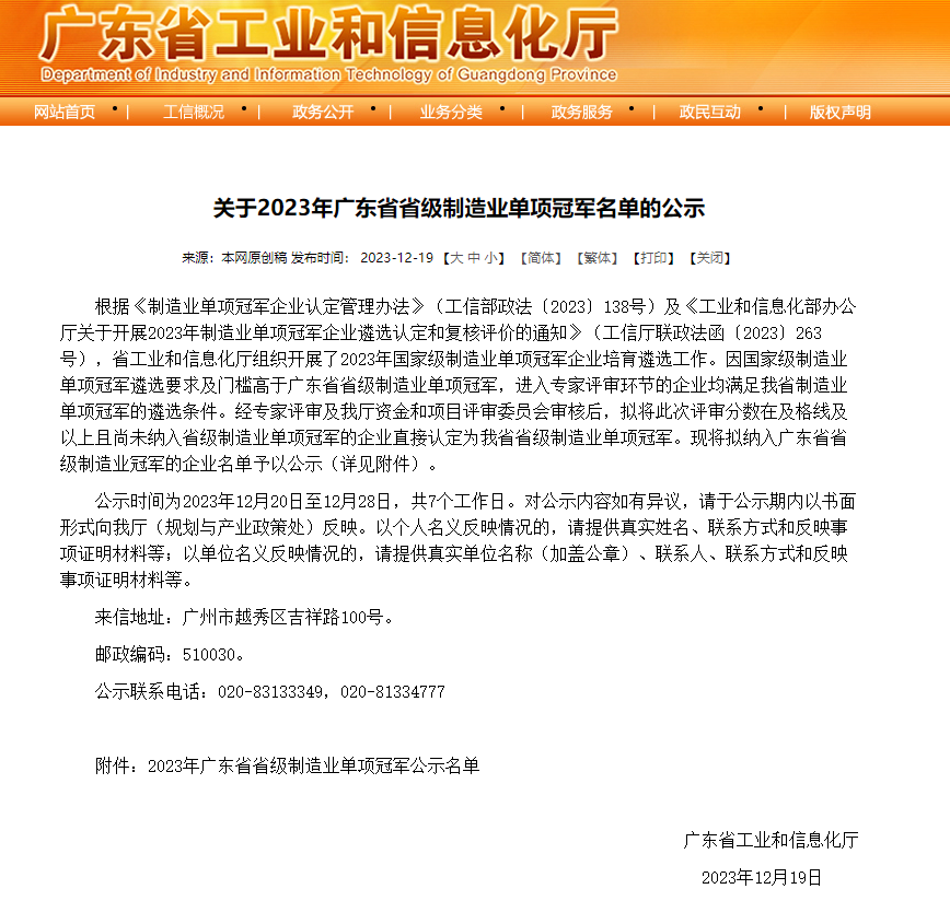 廣東省省級制造業(yè)單項冠軍企業(yè)評選由廣東省工業(yè)和信息化廳主辦,旨在推動廣東省制造業(yè)高質(zhì)量發(fā)展,推動廣東省邁向全球產(chǎn)業(yè)鏈價值鏈中高端。根據(jù)工信部定義,制造業(yè)單項冠軍是指長期專注于制造業(yè)某些特定細(xì)分產(chǎn)品市場,生產(chǎn)技術(shù)或工藝國際領(lǐng)先,單項產(chǎn)品市場占有率位居全球前列的企業(yè)和產(chǎn)品。