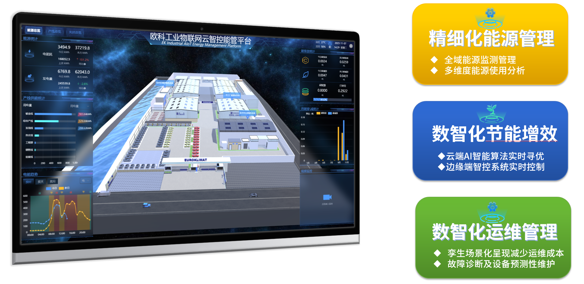 EK-AIoT智慧云系統(tǒng)是EK工業(yè)空調(diào)自主研發(fā)的工業(yè)物聯(lián)網(wǎng)智慧能管平臺(tái),集AI計(jì)算、數(shù)字孿生、互聯(lián)網(wǎng)、物聯(lián)網(wǎng)、移動(dòng)互聯(lián)網(wǎng)于一體,與中央空調(diào)、鋰電行業(yè)轉(zhuǎn)輪除濕等工業(yè)場(chǎng)景相結(jié)合,圍繞數(shù)智化節(jié)能增效和數(shù)智化運(yùn)維管理這兩點(diǎn)核心價(jià)值提供服務(wù),提供了工業(yè)場(chǎng)景云端智能控制、遠(yuǎn)程運(yùn)維、線上協(xié)同、節(jié)能增效等端到端一體式解決方案。