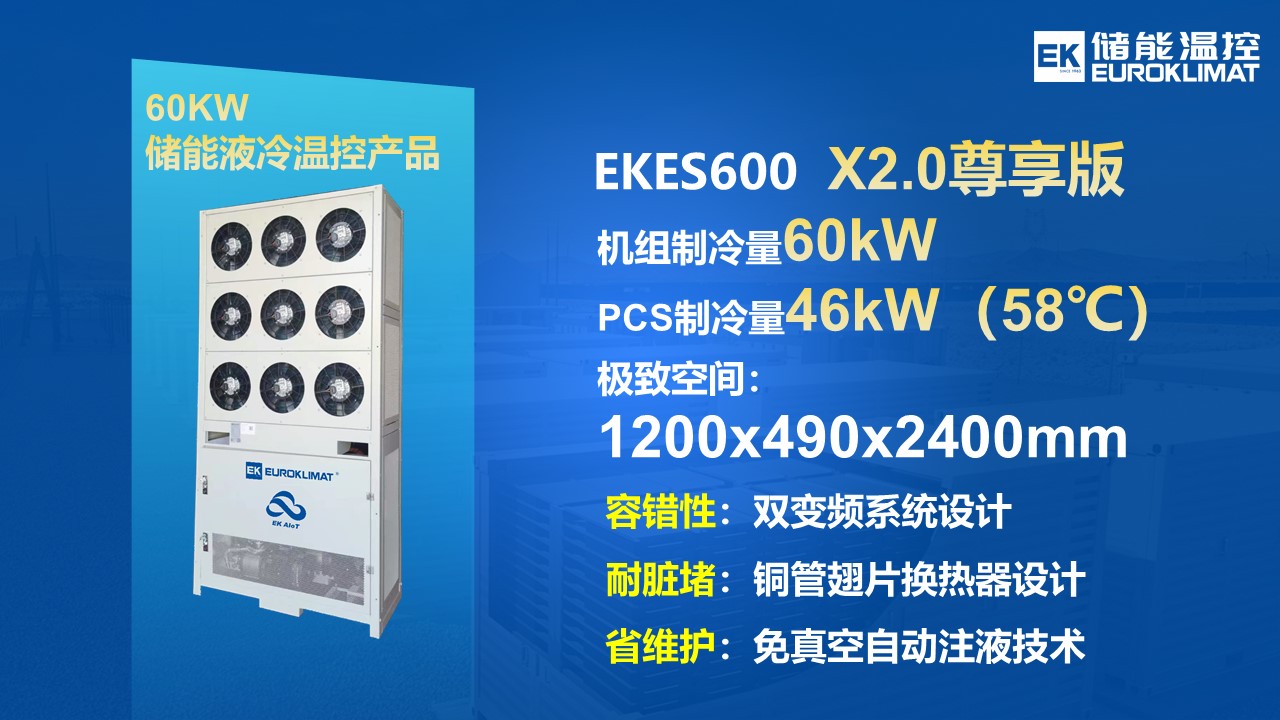 隨著5MWh 儲能系統(tǒng)功率和能量密度的提高,對集成能力的要求也越來越高,提升電芯的散熱性能和溫度均衡能力變得尤為重要。為滿足這一行業(yè)趨勢,EK儲能溫控創(chuàng)新推出了EKES600榮耀版液冷溫控解決方案和EKES600X2.0尊享版液冷溫控解決方案。 EKES600X2.0尊享版液冷溫控解決方案是5MWh 液冷PCS的20尺柜一體化集成方案,采用PACK PCS融合液冷的溫控設計,系統(tǒng)采用FCT3.0自然冷技術,過渡季節(jié)及冬季利用自然冷源調(diào)節(jié)所需冷量,使得系統(tǒng)運行能效提升。另外采用全變頻設計,高效節(jié)能;雙變頻系統(tǒng)設計更具容錯性,銅管翅片換熱器設計耐臟堵,免真空自動注液技術省維護。機組一體化設計,結構緊湊,節(jié)省空間。產(chǎn)品實現(xiàn)儲能環(huán)境和電網(wǎng)系統(tǒng)全適應,保障儲能系統(tǒng)長效運行。