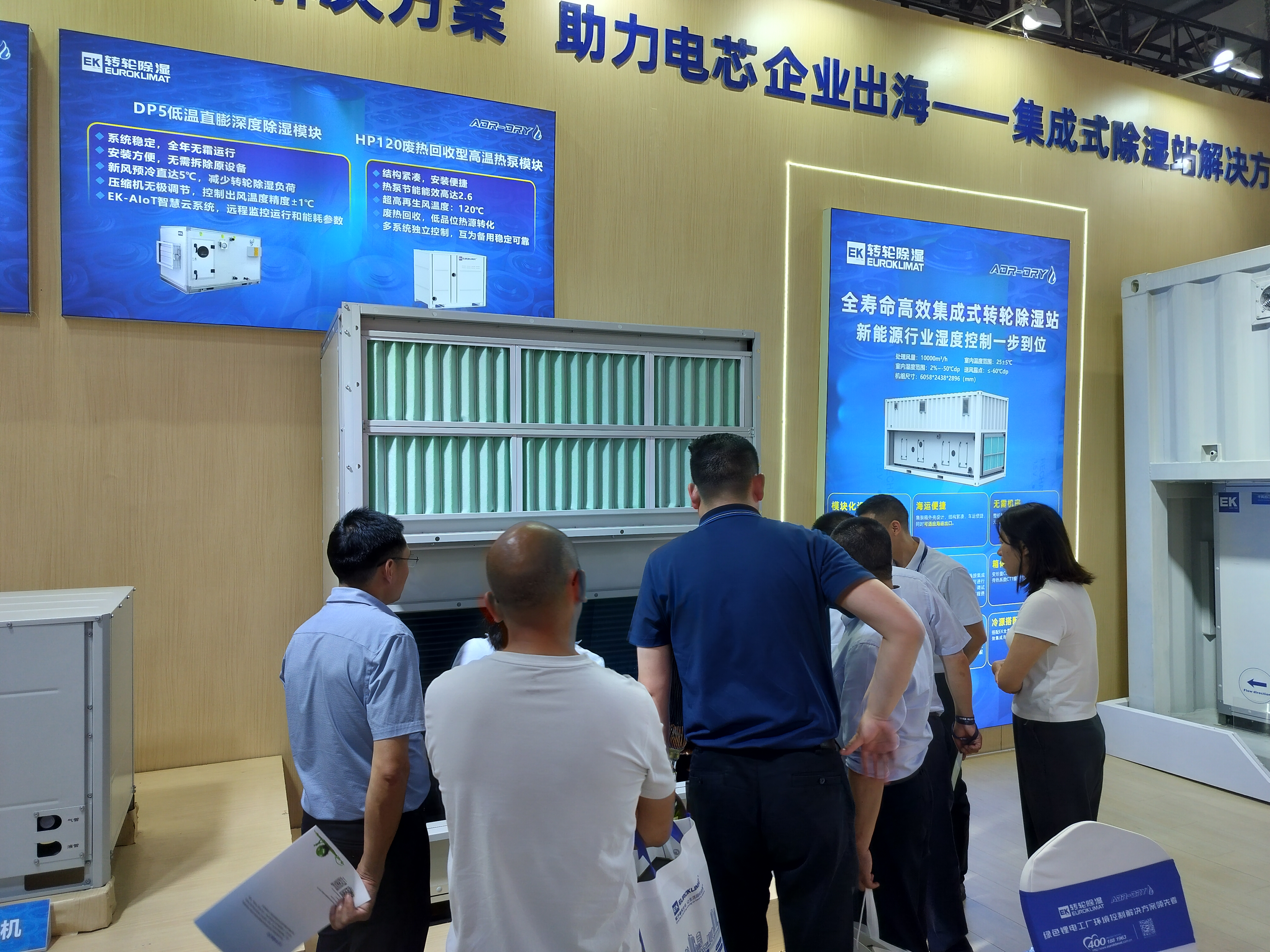 在這一背景下,EK工業(yè)空調(diào)展出了助力鋰電產(chǎn)業(yè)鏈企業(yè)出海的核心產(chǎn)品——全壽命高效集成式轉(zhuǎn)輪除濕站。該除濕站是基于LCC全壽命周期成本、產(chǎn)品全集成、嵌入產(chǎn)線、整機出廠、標準集裝箱運輸、現(xiàn)場“0”施工、云端控制、全球化等理念設(shè)計的,機組通過美國AHRI認證和CE認證,解決了行業(yè)內(nèi)除濕系統(tǒng)交付工程量大、運行能耗高的難題,實現(xiàn)新能源行業(yè)濕度控制的一步到位,為電芯企業(yè)出海之路提供了可靠的技術(shù)支撐。