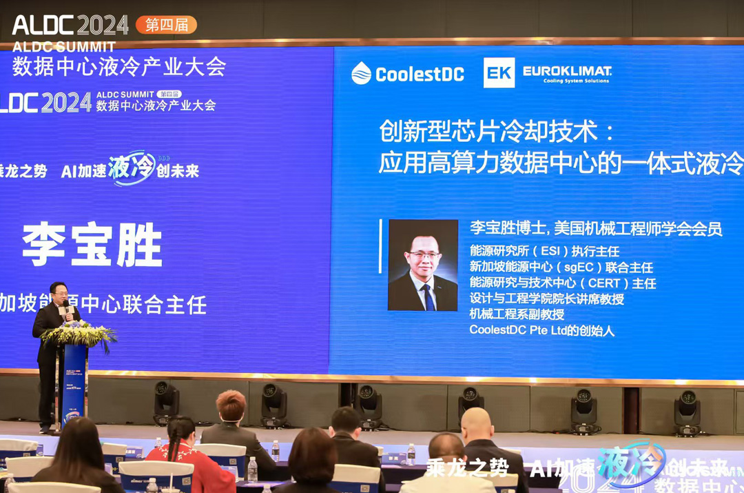 EK空調(diào)高度重視液冷技術(shù)創(chuàng)新,聯(lián)合新加坡國立大學(xué)共同研發(fā)液冷和液冷熱回收等系統(tǒng)解決方案。在此次行業(yè)盛會上,新加坡國立大學(xué)李教授發(fā)表題為《創(chuàng)新型芯片冷卻技術(shù):應(yīng)用高算力數(shù)據(jù)中心的一體式液冷防漏冷板》的主題報告。李教授指出,算力需求推動著數(shù)據(jù)中心功率密度不斷提升,能耗與發(fā)熱量也隨之攀升,傳統(tǒng)風(fēng)冷方案已難以滿足IT設(shè)備的散熱需求。