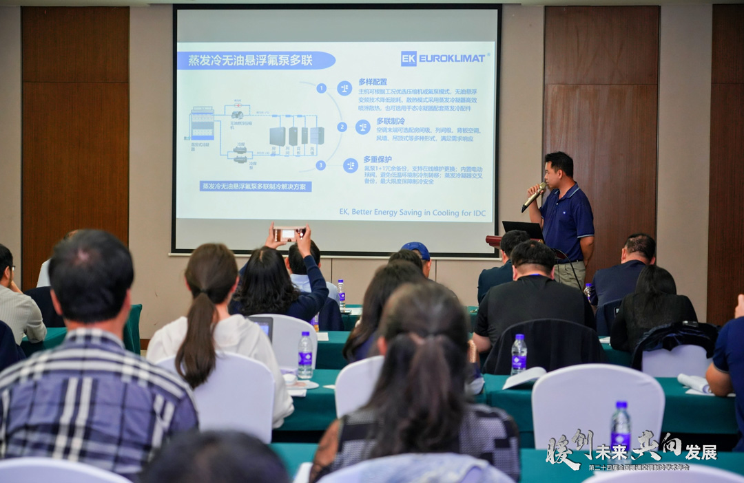 在演講中,古正中詳細介紹EK間接蒸發(fā)冷卻機組、無油懸浮多聯(lián)蒸發(fā)冷機組和一體式蒸發(fā)冷螺桿冷水機組等綠色低碳系統(tǒng)方案,為行業(yè)帶來EK空調在蒸發(fā)冷技術方面的思路和解決方案。