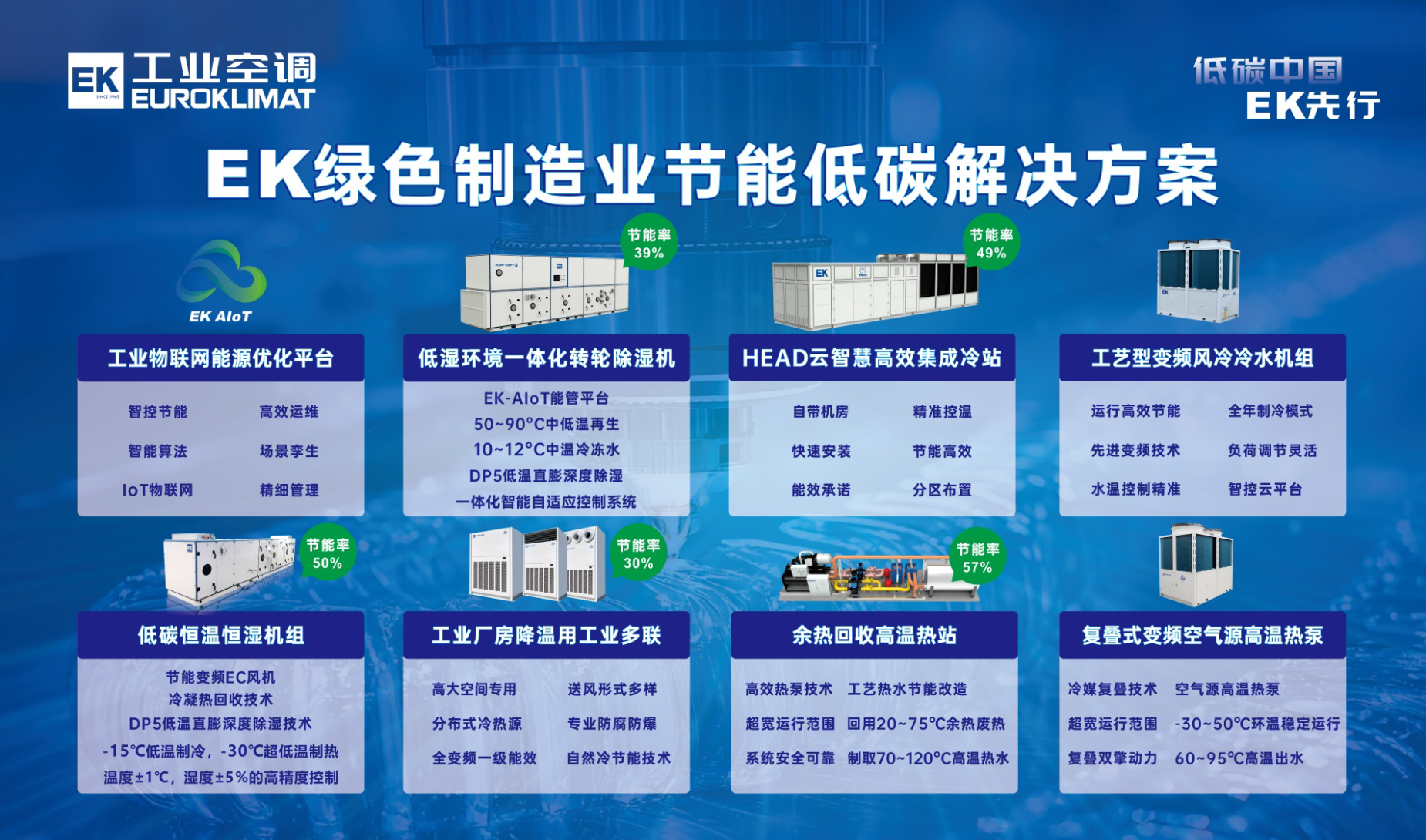 對(duì)此,EK工業(yè)空調(diào)以“綠色、低碳、智能”為關(guān)鍵詞,分別提供多管制冷熱平衡機(jī)、分布式高效集成冷站、溫濕分控新風(fēng)調(diào)濕機(jī)、TITAN工業(yè)凈化組空、一體化高效轉(zhuǎn)輪除濕機(jī)、EK-AIoT工業(yè)用戶云平臺(tái)等解決方案,破解零碳難題,助力工業(yè)企業(yè)從耗能大戶升級(jí)為減碳標(biāo)桿。