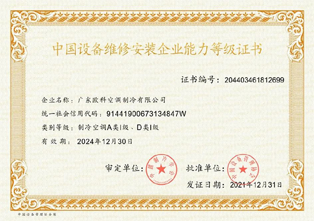 “中國(guó)設(shè)備維修安裝企業(yè)能力等級(jí)證書(shū)(制冷空調(diào)A類Ⅰ級(jí)、D類Ⅰ級(jí))”則由中國(guó)制冷學(xué)會(huì)和中國(guó)設(shè)備管理協(xié)會(huì)認(rèn)證頒發(fā),皆是行業(yè)認(rèn)可的權(quán)威認(rèn)證。